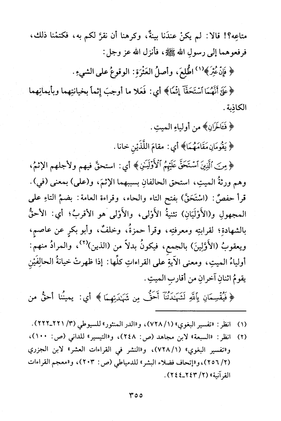 {مِنَ الَّذِينَ اسْتَحَقَّ عَلَيْهِمُ الْأَوْلَيَانِ} أي: استحقَّ فيهم ولأجلهم الإثمُ، وهم ورثةُ الميتِ، استحق الحالفانِ بسببهما الإثمَ، و (على) بمعنى (في). قرأ حفصٌ: (اسْتَحَقَّ) بفتح التاء والحاء، وقراءة العامة: بضمِّ التاءِ على المجهولِ و (الأَوْلَيَانِ) تثنيةُ الأَوْلى، والأَوْلى هو الأقربُ؛ أي: الأحقُّ بالشهادةِ؛ لقرابتِه ومعرفتِه، وقرأ حمزةُ، وخلفٌ، وأبو بكرٍ عن عاصمٍ، ويعقوبُ (الأَوَّلِينَ) بالجمعِ، فيكونُ بدلًا من (الذين) (¬2)، والمرادُ منهم: أولياءُ الميتِ، ومعنى الآيةِ على القراءاتِ كلِّها: إذا ظهرتْ خيانةُ الحالِفَيْنِ يقومُ اثنانِ آخرانِ من أقاربِ الميتِ.