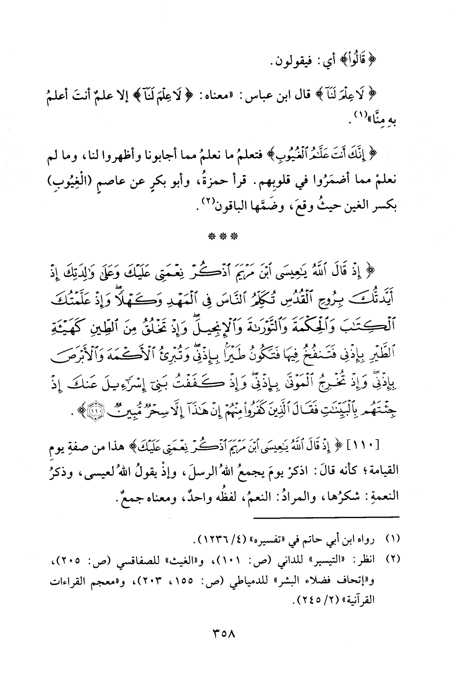 [110] {إِذْ قَالَ اللَّهُ يَاعِيسَى ابْنَ مَرْيَمَ اذْكُرْ نِعْمَتِي عَلَيْكَ} هذا من صفةِ يومِ القيامة؛ كأنه قالَ: اذكرْ يومَ يجمعُ اللهُ الرسلَ، وإذْ يقولُ اللهُ لعيسى، وذكرُ النعمةِ: شكرُها، والمرادُ: النعمُ، لفظُه واحدٌ، ومعناه جمعٌ.