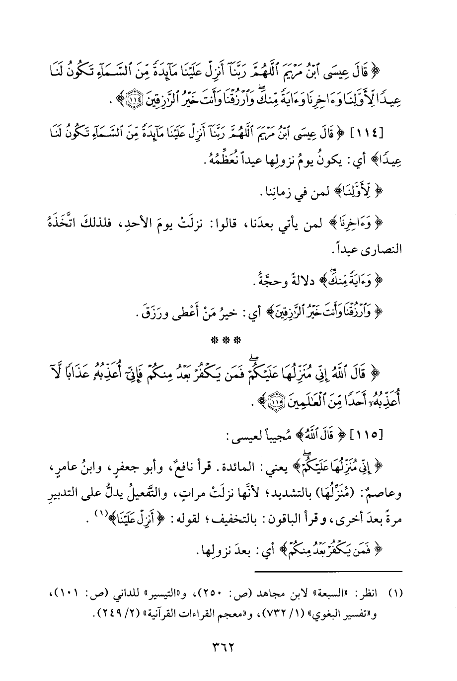 [114] {قَالَ عِيسَى ابْنُ مَرْيَمَ اللَّهُمَّ رَبَّنَا أَنْزِلْ عَلَيْنَا مَائِدَةً مِنَ السَّمَاءِ تَكُونُ لَنَا عِيدًا} أي: يكونُ يومُ نزولِها عيدًا نُعَظِّمُهُ.