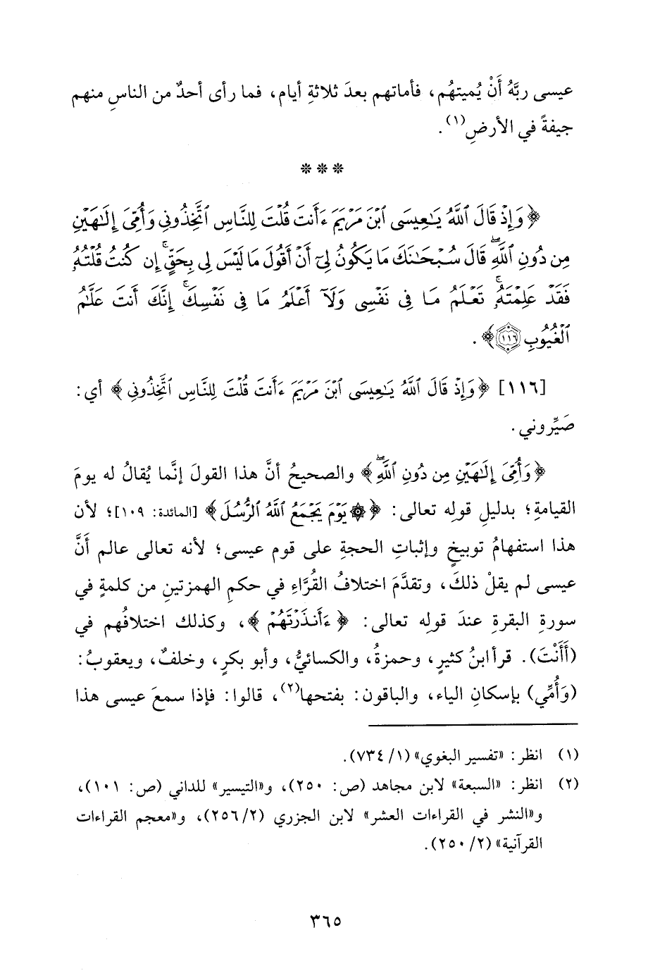 {وَأُمِّيَ إِلَهَيْنِ مِنْ دُونِ اللَّهِ} والصحيحُ أنَّ هذا القولَ إنَّما يُقالُ له يومَ القيامةِ، بدليلِ قوله تعالى: {يَوْمَ يَجْمَعُ اللَّهُ الرُّسُلَ} [المائدة: 109]؛ لأن هذا استفهامُ توبيخٍ وإثباتِ الحجةِ على قوم عيسى؛ لأنه تعالى عالم أَنَّ عيسى لم يقلْ ذلكَ، وتقدَّمَ اختلافُ القُرَّاءِ في حكمِ الهمزتينِ من كلمةٍ في سورةِ البقرةِ عندَ قوله تعالى: {أَأَنْذَرْتَهُمْ}، وكذلك اختلافُهم في (أَأَنْتَ). قرأ ابنُ كثيرٍ، وحمزةُ، والكسائيُّ، وأبو بكرٍ، وخلفٌ، ويعقوبُ: (وَأُمِّي) بإسكانِ الياء، والباقون: بفتحها (¬2)، قالوا: فإذا سمعَ عيسى هذا