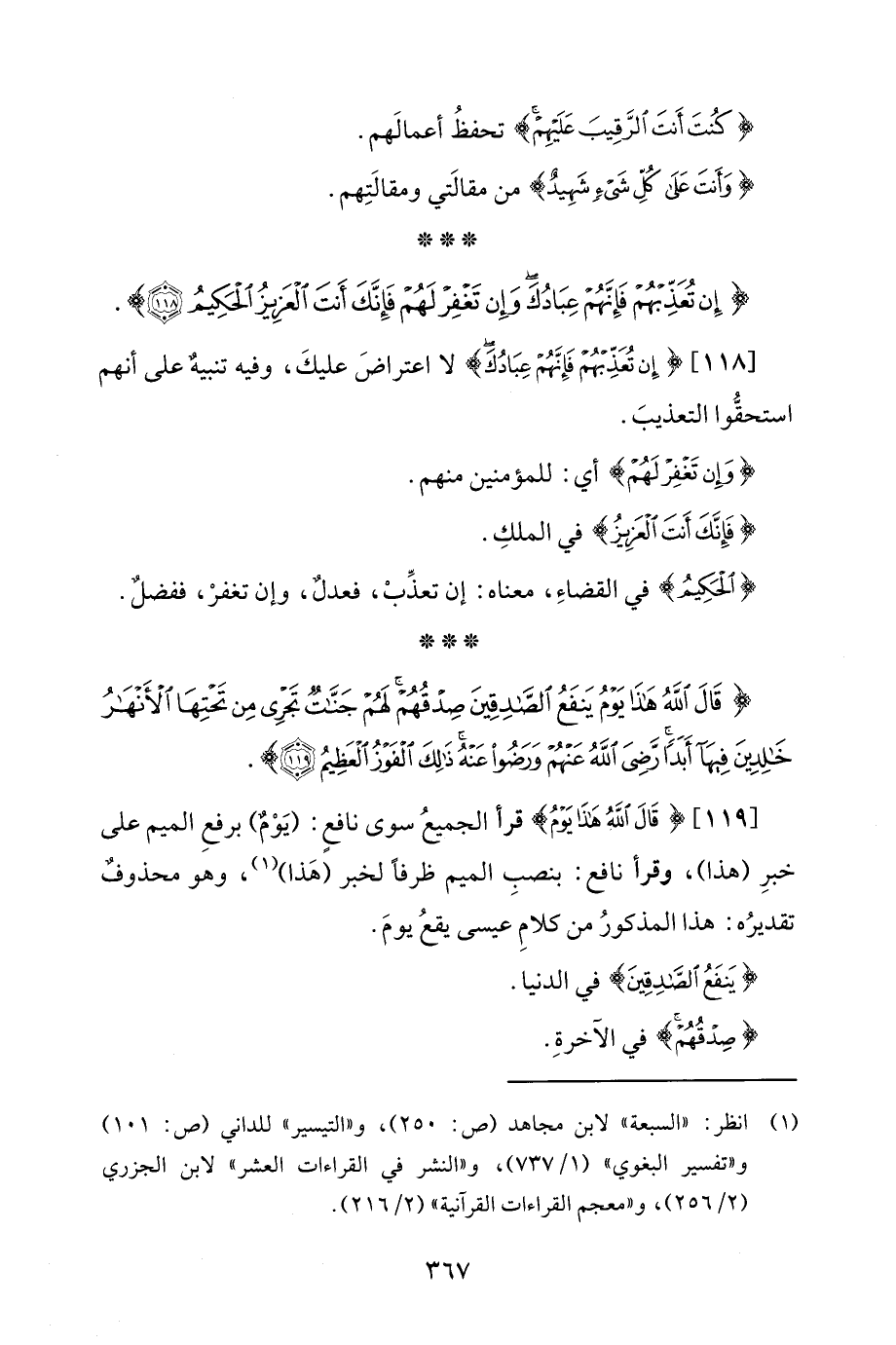 [119] {قَالَ اللَّهُ هَذَا يَوْمُ} قرأ الجميعُ سوى نافعٍ: (يَوْمٌ) برفعِ الميم على خبرِ (هذا)، وقرأ نافع: بنصبِ الميم ظرفًا لخبر (هَذا) (¬1)، وهو محذوفٌ تقديرُه: هذا المذكورُ من كلامِ عيسى يقعُ يومَ.