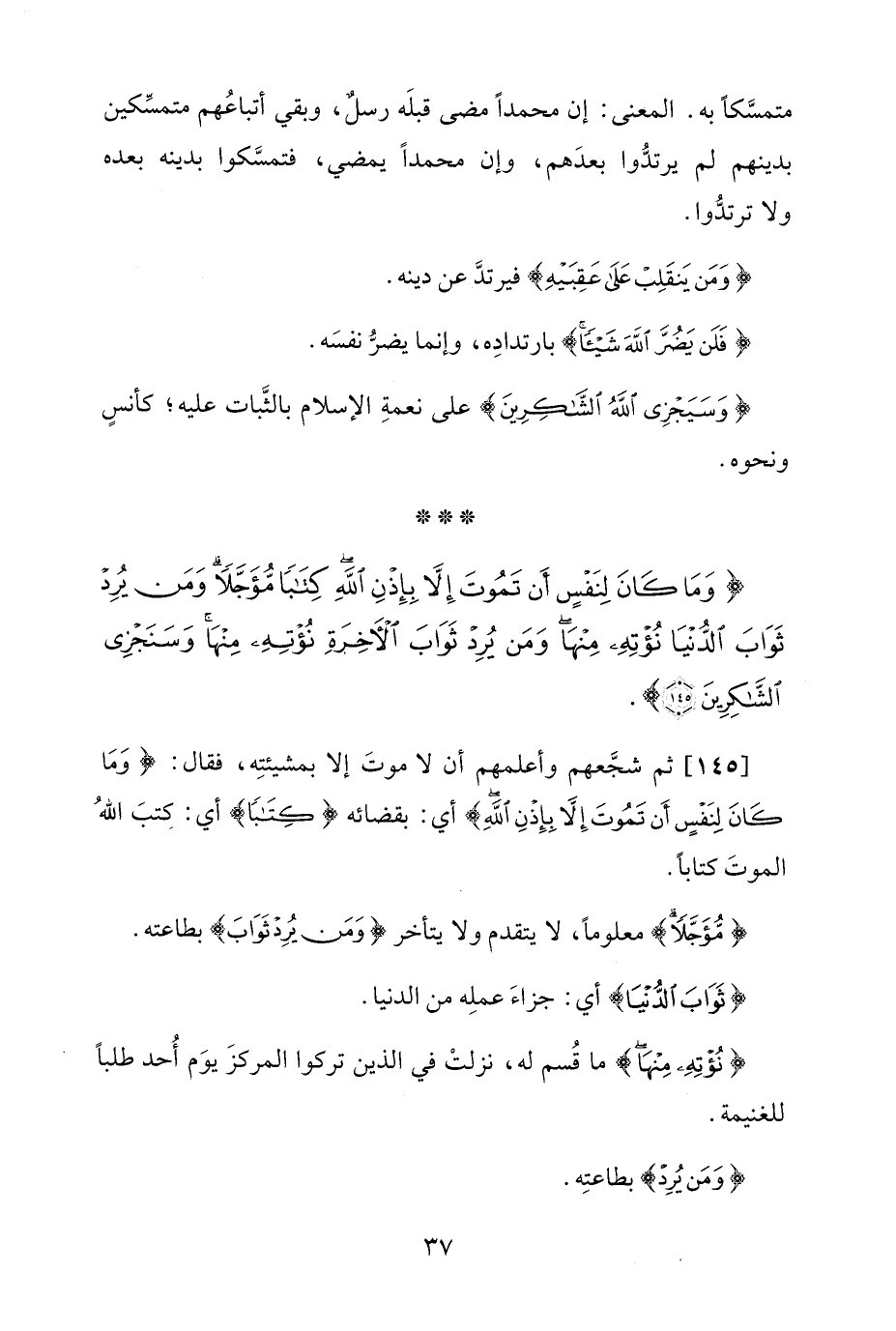 {وَمَا كَانَ لِنَفْسٍ أَنْ تَمُوتَ إِلَّا بِإِذْنِ اللَّهِ كِتَابًا مُؤَجَّلًا وَمَنْ يُرِدْ ثَوَابَ الدُّنْيَا نُؤْتِهِ مِنْهَا وَمَنْ يُرِدْ ثَوَابَ الْآخِرَةِ نُؤْتِهِ مِنْهَا وَسَنَجْزِي الشَّاكِرِينَ (145)}.