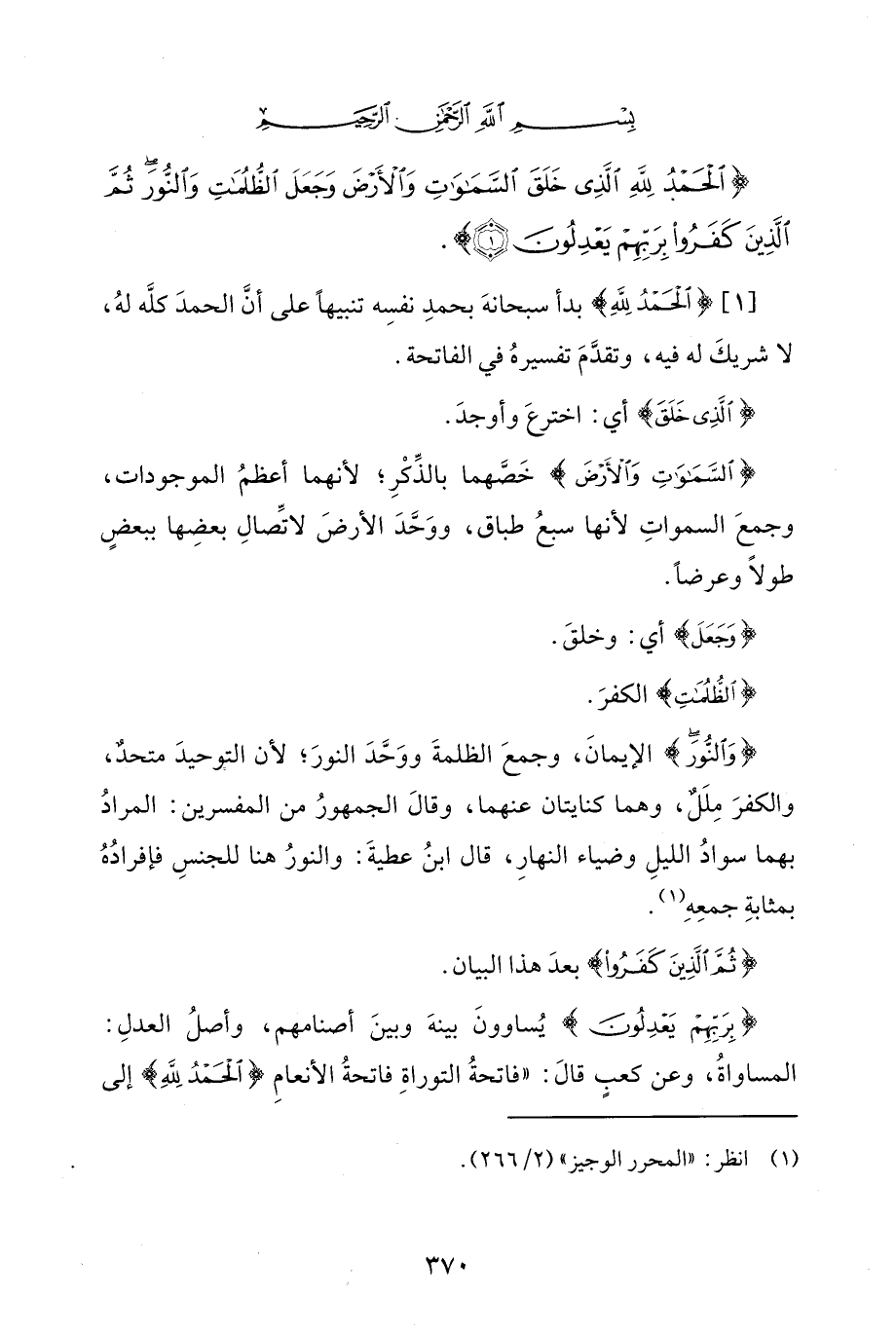 {الْحَمْدُ لِلَّهِ الَّذِي خَلَقَ السَّمَاوَاتِ وَالْأَرْضَ وَجَعَلَ الظُّلُمَاتِ وَالنُّورَ ثُمَّ الَّذِينَ كَفَرُوا بِرَبِّهِمْ يَعْدِلُونَ (1)}.