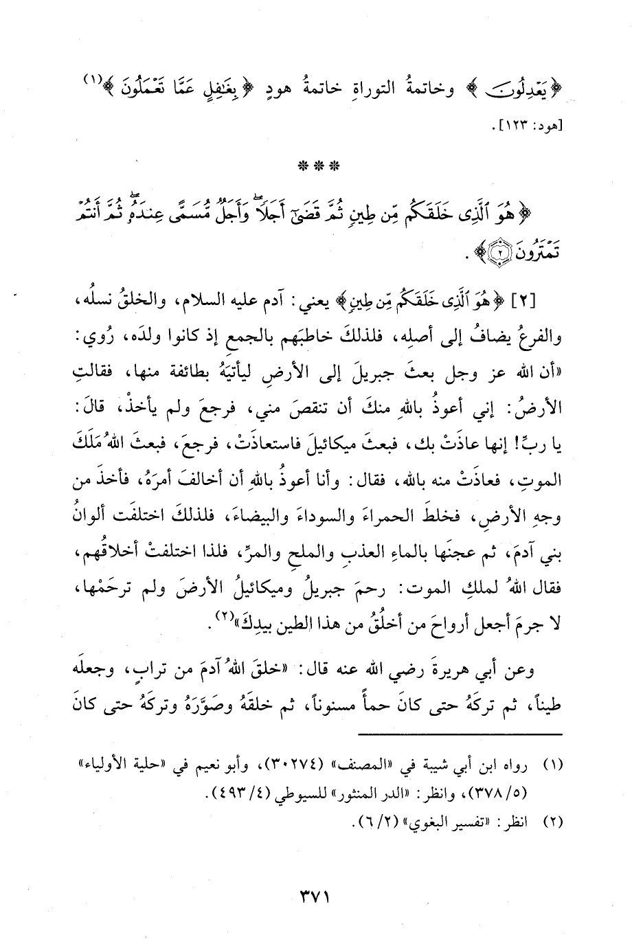 [2] {هُوَ الَّذِي خَلَقَكُمْ مِنْ طِينٍ} يعني: آدم عليه السلام، والخلقُ نسلُه، والفرعُ يضافُ إلى أصلِه، فلذلكَ خاطبَهم بالجمعِ إذ كانوا ولدَه، رُوي: "أن الله عز وجل بعثَ جبريلَ إلى الأرضِ ليأتيَهُ بطائفة منها، فقالتِ الأرضُ: إني أعوذُ باللهِ منكَ أن تنقصَ مني، فرجعَ ولم يأخذْ، قالَ: يا ربِّ! إنها عاذَتْ بك، فبعثَ ميكائيلَ فاستعاذَتْ، فرجعَ، فبعثَ اللهُ مَلَكَ الموتِ، فعاذَتْ منه بالله، فقال: وأنا أعوذُ باللهِ أن أخالفَ أمرَهُ، فأخذَ من وجهِ الأرضِ، فخلطَ الحمراءَ والسوداءَ والبيضاءَ، فلذلكَ اختلفَت ألوانُ بني آدمَ، ثم عجنَها بالماءِ العذبِ والملحِ والمرِّ، فلذا اختلفتْ أخلاقُهم، فقال اللهُ لملكِ الموت: رحمَ جبريلُ وميكائيلُ الأرضَ ولم ترحَمْها، لا جرمَ أجعل أرواحَ من أخلُقُ من هذا الطين بيدِكَ" (¬2).