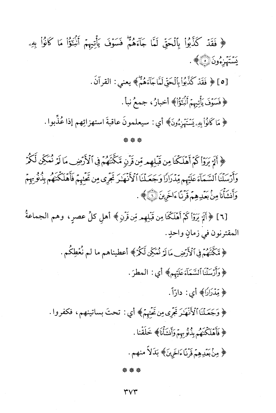 [6] {أَلَمْ يَرَوْا كَمْ أَهْلَكْنَا مِنْ قَبْلِهِمْ مِنْ قَرْنٍ} أهلِ كلِّ عصرٍ، وهم الجماعةُ المقترنون في زمانٍ واحدٍ.