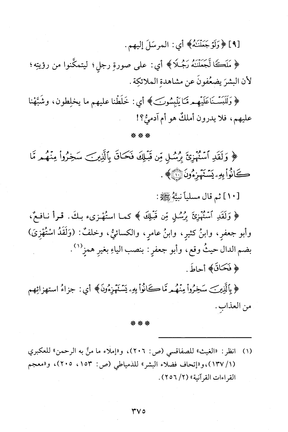 {وَلَقَدِ اسْتُهْزِئَ بِرُسُلٍ مِنْ قَبْلِكَ} كما استُهْزئ بكَ. قرأ نافعٌ، وأبو جعفرٍ، وابنُ كثيرٍ، وابنُ عامرٍ، والكسائيُّ، وخلفٌ: (وَلَقَدُ اسْتُهْزِىَ) بضم الدال حيثُ وقع، وأبو جعفرٍ: بنصب الياءِ بغيرِ همزٍ (¬1).