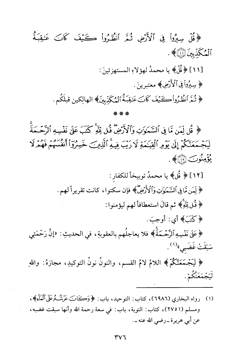 {قُلْ لِمَنْ مَا فِي السَّمَاوَاتِ وَالْأَرْضِ قُلْ لِلَّهِ كَتَبَ عَلَى نَفْسِهِ الرَّحْمَةَ لَيَجْمَعَنَّكُمْ إِلَى يَوْمِ الْقِيَامَةِ لَا رَيْبَ فِيهِ الَّذِينَ خَسِرُوا أَنْفُسَهُمْ فَهُمْ لَا يُؤْمِنُونَ (12)}.