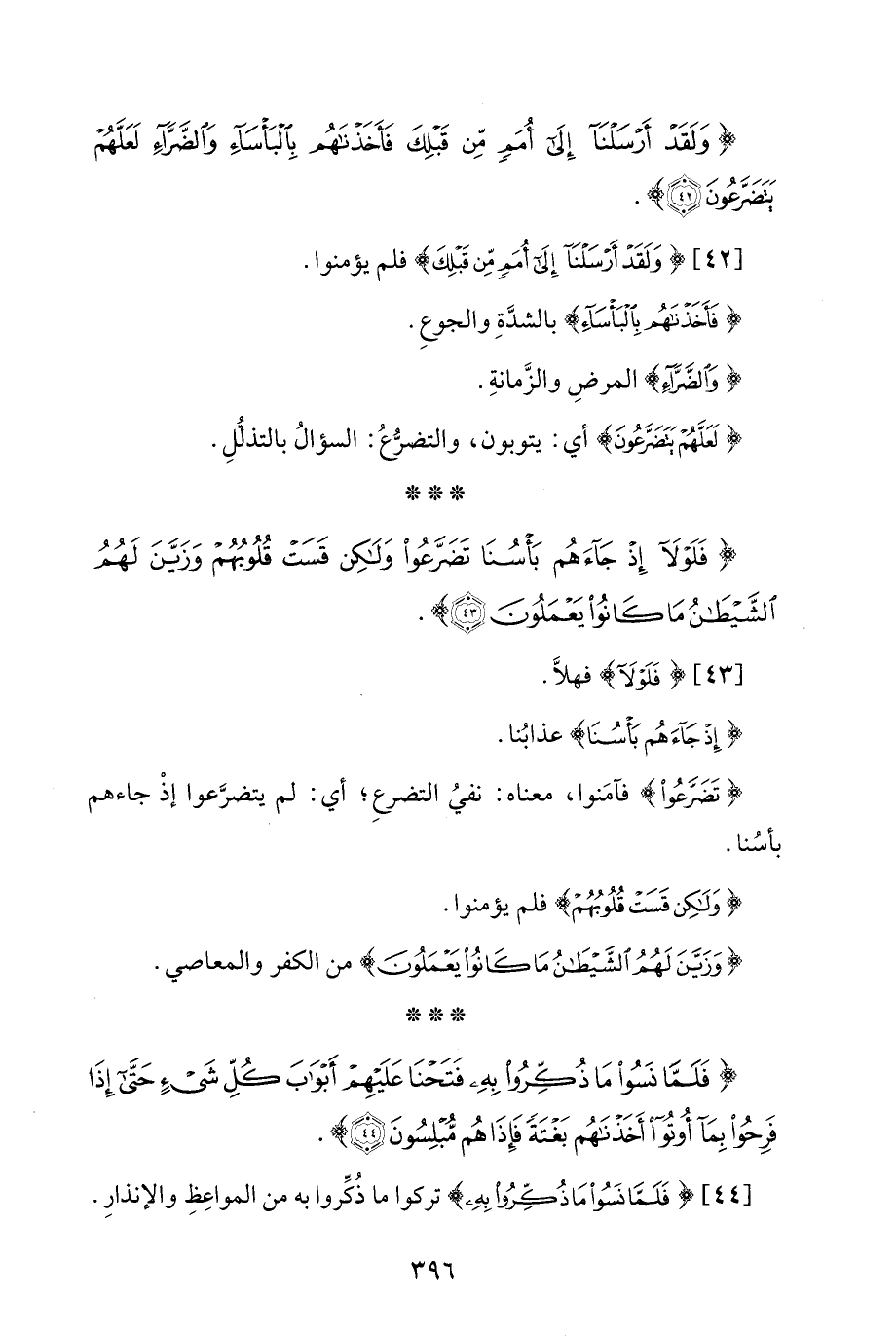 {وَلَقَدْ أَرْسَلْنَا إِلَى أُمَمٍ مِنْ قَبْلِكَ فَأَخَذْنَاهُمْ بِالْبَأْسَاءِ وَالضَّرَّاءِ لَعَلَّهُمْ يَتَضَرَّعُونَ (42)}.