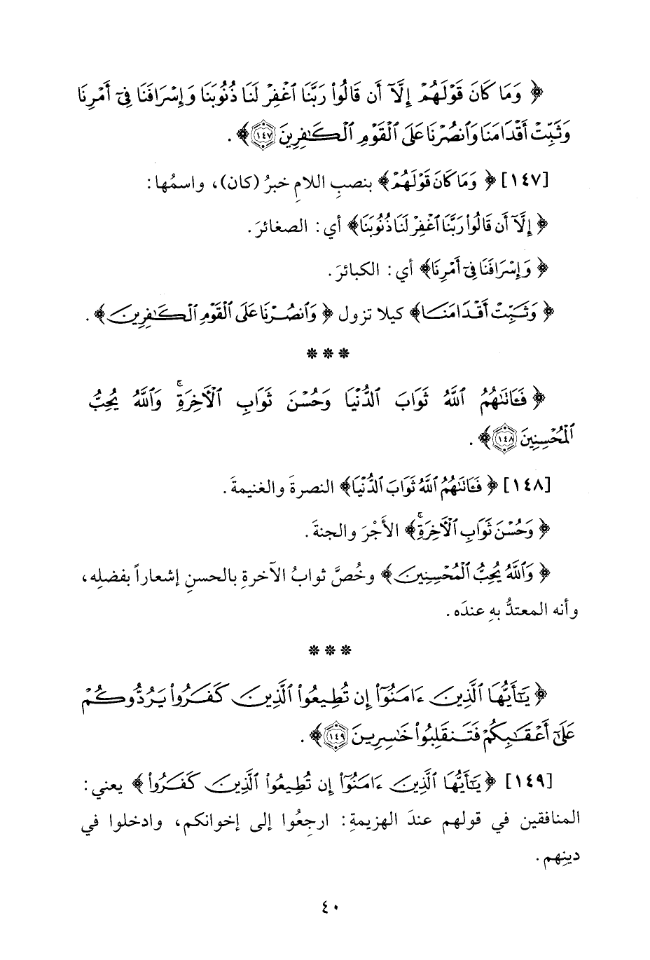 {وَمَا كَانَ قَوْلَهُمْ إِلَّا أَنْ قَالُوا رَبَّنَا اغْفِرْ لَنَا ذُنُوبَنَا وَإِسْرَافَنَا فِي أَمْرِنَا وَثَبِّتْ أَقْدَامَنَا وَانْصُرْنَا عَلَى الْقَوْمِ الْكَافِرِينَ (147)}.