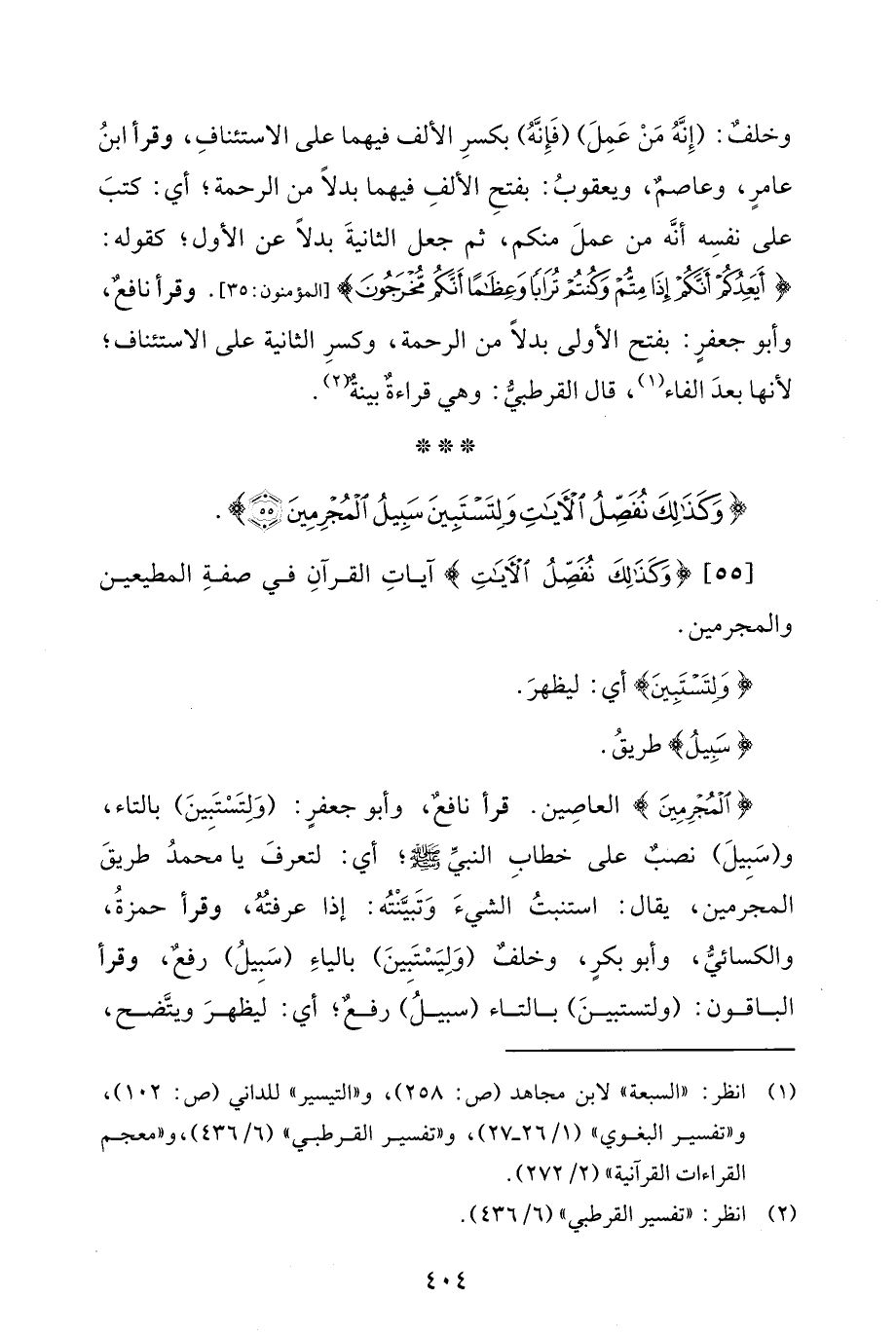 {الْمُجْرِمِينَ} العاصِين. قرأ نافعٌ، وأبو جعفرٍ: (وَلِتَسْتَبِينَ) بالتاء، و (سَبِيلَ) نصبٌ على خطابِ النبيِّ - صلى الله عليه وسلم -؛ أي: لتعرفَ يا محمدُ طريقَ المجرمين، يقال: استنبتُ الشيءَ وَتَبيَّنْتُه: إذا عرفتُهُ، وقرأ حمزةُ، والكسائيُّ، وأبو بكرٍ، وخلفٌ (وَلِيَسْتَبِينَ) بالياءِ (سَبيلُ) رفعٌ، وقرأ الباقون: (ولتستبينَ) بالتاء (سبيلُ) رفعٌ؛ أي: ليظهرَ ويتَّضح،