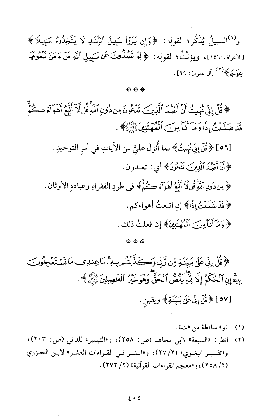 و (¬1) السبيلُ يُذَكَّر؛ لقوله: {وَإِنْ يَرَوْا سَبِيلَ الْغَيِّ يَتَّخِذُوهُ سَبِيلًا} [الأعراف: 146]، ويؤنَّثُ؛ لقولِه: {لِمَ تَصُدُّونَ عَنْ سَبِيلِ اللَّهِ مَنْ آمَنَ تَبْغُونَهَا عِوَجًا} (¬2) [آل عمران: 99].