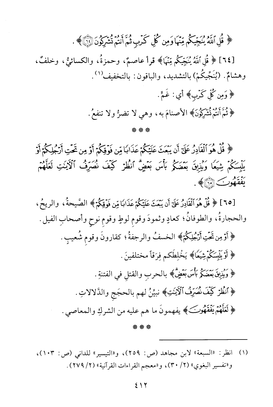[64] {قُلِ اللَّهُ يُنَجِّيكُمْ مِنْهَا} قرأ عاصمٌ، وحمزةُ، والكسائيُّ، وخلفٌ، وهشامٌ. (يُنَجِّيكُمْ) بالتشديد، والباقون: بالتخفيف (¬1).