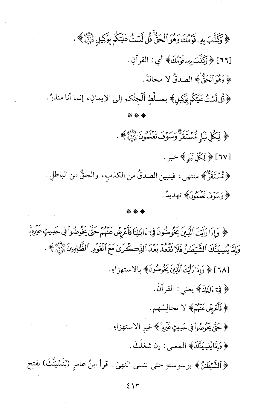 [68] {وَإِذَا رَأَيْتَ الَّذِينَ يَخُوضُونَ} بالاستهزاءِ.