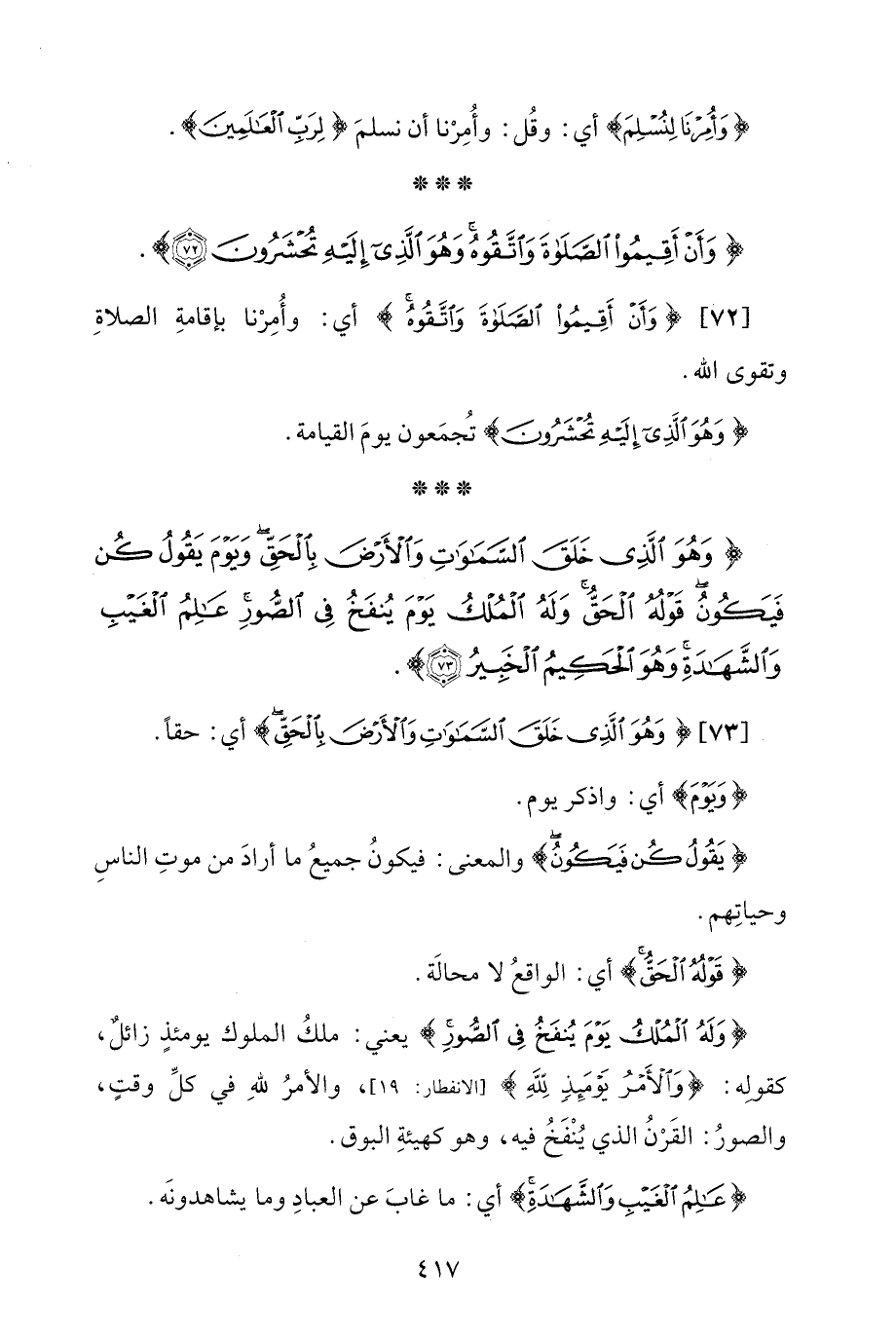 {وَهُوَ الَّذِي خَلَقَ السَّمَاوَاتِ وَالْأَرْضَ بِالْحَقِّ وَيَوْمَ يَقُولُ كُنْ فَيَكُونُ قَوْلُهُ الْحَقُّ وَلَهُ الْمُلْكُ يَوْمَ يُنْفَخُ فِي الصُّورِ عَالِمُ الْغَيْبِ وَالشَّهَادَةِ وَهُوَ الْحَكِيمُ الْخَبِيرُ (73)}.