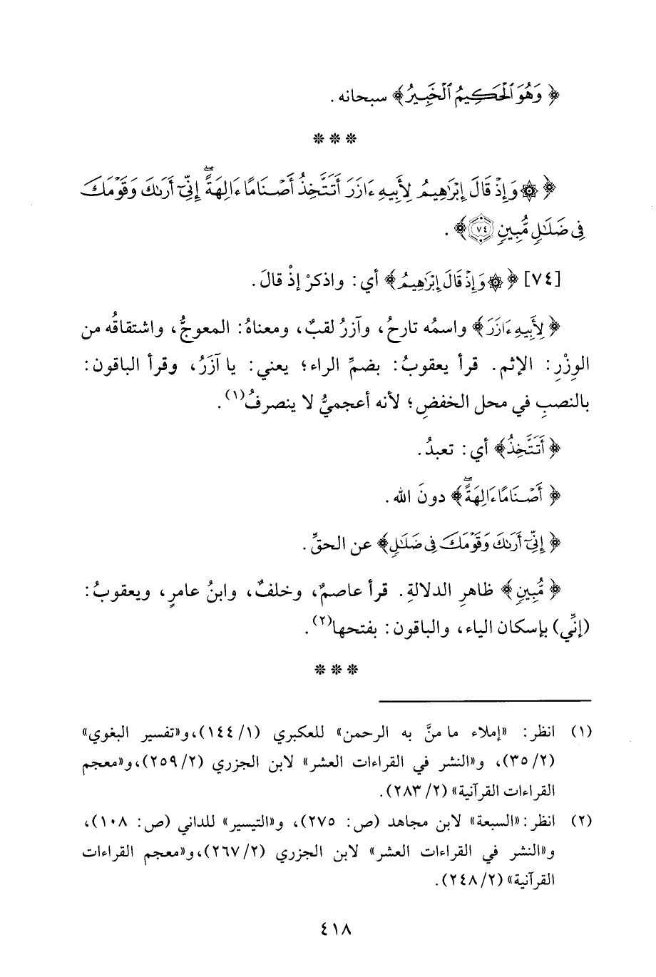 {لِأَبِيهِ آزَرَ} واسمُه تارحُ، وآزرُ لقبٌ، ومعناهُ: المعوجُّ، واشتقاقُه من الوِزْرِ: الإثم. قرأ يعقوبُ: بضمِّ الراء؛ يعني: يا آزَرُ، وقرأ الباقون: بالنصبِ في محل الخفضِ؛ لأنه أعجميُّ لا ينصرفُ (¬1).