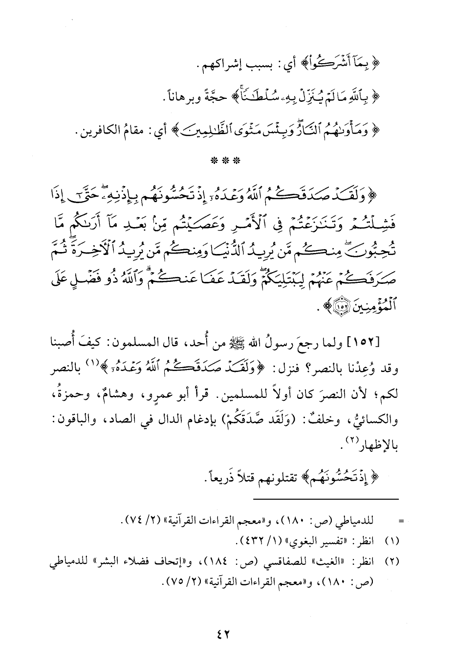 [152] ولما رجعَ رسول الله - صلى الله عليه وسلم - من أُحد، قال المسلمون: كيفَ أُصبنا وقد وُعِدْنا بالنصر؟ فنزل: {وَلَقَدْ صَدَقَكُمُ اللَّهُ وَعْدَهُ} (¬1) بالنصر لكم؛ لأن النصرَ كان أولًا للمسلمين. قرأ أبو عمرٍو، وهشامٌ، وحمزةُ، والكسائيُّ، وخلفٌ: (وَلَقَد صَّدَقَكُمْ) بإدغام الدال في الصاد، والباقون: بالإظهار (¬2).