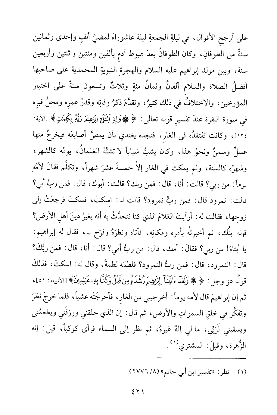 على أرجحِ الأقوال، في ليلةِ الجمعةِ ليلة عاشوراءَ لمضيِّ ألفٍ وإحدى وثمانين سنةً من الطوفانِ، وكان الطوفانُ بعدَ هبوط آدمِ بألفين ومئتين واثنتين وأربعين سنة، وبين مولد إبراهيم عليه السلام والهجرةِ النبويةِ المحمدية على صاحبها أفضلُ الصلاة والسلامِ ألفانٌ وثمانُ مئةٍ وثلاثٌ وتسعون سنةً على اختيار المؤرخين، والاختلافُ في ذلك كثير، وتقدَّمَ ذكرُ وفاتِه وقدرُ عمرِه ومحلُّ قبرِه في سورة البقرة عندَ تفسيرِ قوله تعالى: {وَإِذِ ابْتَلَى إِبْرَاهِيمَ رَبُّهُ بِكَلِمَاتٍ} [الآية: 124]، وكانت تفتقدُه في الغارِ، فتجده يغتذي بأن يمصَّ أصابعَه فيخرجُ منها عسلٌ وسمنٌ ونحوُ هذا، وكان يشبُّ شبابًا لا تشبُّهُ الغلمانُ، يومُه كالشهر، وشهرُه كالسنة، ولم يمكثْ في الغار إلَّا خمسةَ عشرَ شهرًا، وتكلَّم فقالَ لأمِّهِ يومًا: من ربي؟ قالت: أنا، قال: فمن ربك؟ قالت: أبوك، قال: فمن ربُّ أبي؟ قالت: نمرود قال: فمن ربُّ نمرود؟ قالت له: اسكتْ، فسكتَ فرجعَتْ إلى زوجِها، فقالت له: أرأيتَ الغلامَ الذي كنا نتحدَّثُ به أنه يغيرُ دينَ أهلِ الأرض؟ فإنه ابنُك، ثم أخبرتْه بأمره ومكانِه، فأتاه ونظرَهُ وفرَح به، فقال له إبراهيم: يا أبتاهُ! من ربي؟ فقالَ: أمك، قال: من ربُّ أمي؟ قال: أنا، قال: فمن ربُّكَ؟ قال: النمرود، قال: فمن ربُّ النمرود؟ فلطمَه لطمةً، وقال له: اسكتْ، فذلكَ قولُه عز وجل: {وَلَقَدْ آتَيْنَا إِبْرَاهِيمَ رُشْدَهُ مِنْ قَبْلُ وَكُنَّا بِهِ عَالِمِينَ} [الأنبياء: 51]، ثم إن إبراهيمَ قال لأمه يومًا: أخرجيني من الغارِ، فأخرجَتْه عشيًّا، فلما خرجَ نظرَ وتفكَّر في خلقِ السمواتِ والأرض، ثم قال: إن الذي خلقني ورزقَني ويطعمُني ويسقيني لَرَبِّي، ما لي إلهٌ غيرهُ، ثم نظر إلى السماء فرأى كوكبًا، قيل: إنه الزُّهرة، وقيلَ: المشتري (¬1).