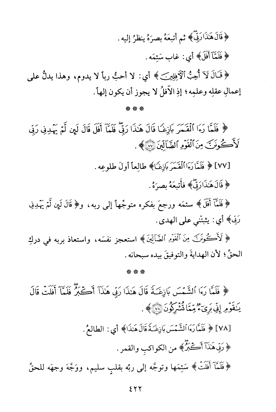 {فَلَمَّا رَأَى الْقَمَرَ بَازِغًا قَالَ هَذَا رَبِّي فَلَمَّا أَفَلَ قَالَ لَئِنْ لَمْ يَهْدِنِي رَبِّي لَأَكُونَنَّ مِنَ الْقَوْمِ الضَّالِّينَ (77)}.