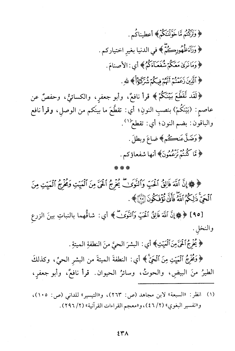 [95] {إِنَّ اللَّهَ فَالِقُ الْحَبِّ وَالنَّوَى} أي: شاقُّهما بالنباتِ بينَ الزرعِ والنخلِ.