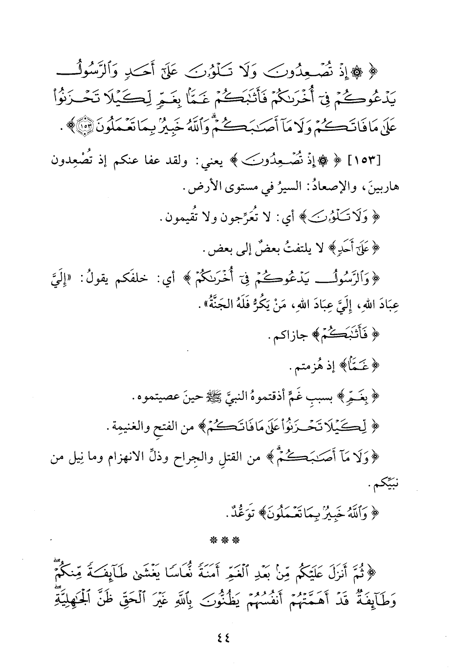 {إِذْ تُصْعِدُونَ وَلَا تَلْوُونَ عَلَى أَحَدٍ وَالرَّسُولُ يَدْعُوكُمْ فِي أُخْرَاكُمْ فَأَثَابَكُمْ غَمًّا بِغَمٍّ لِكَيْلَا تَحْزَنُوا عَلَى مَا فَاتَكُمْ وَلَا مَا أَصَابَكُمْ وَاللَّهُ خَبِيرٌ بِمَا تَعْمَلُونَ (153)}.