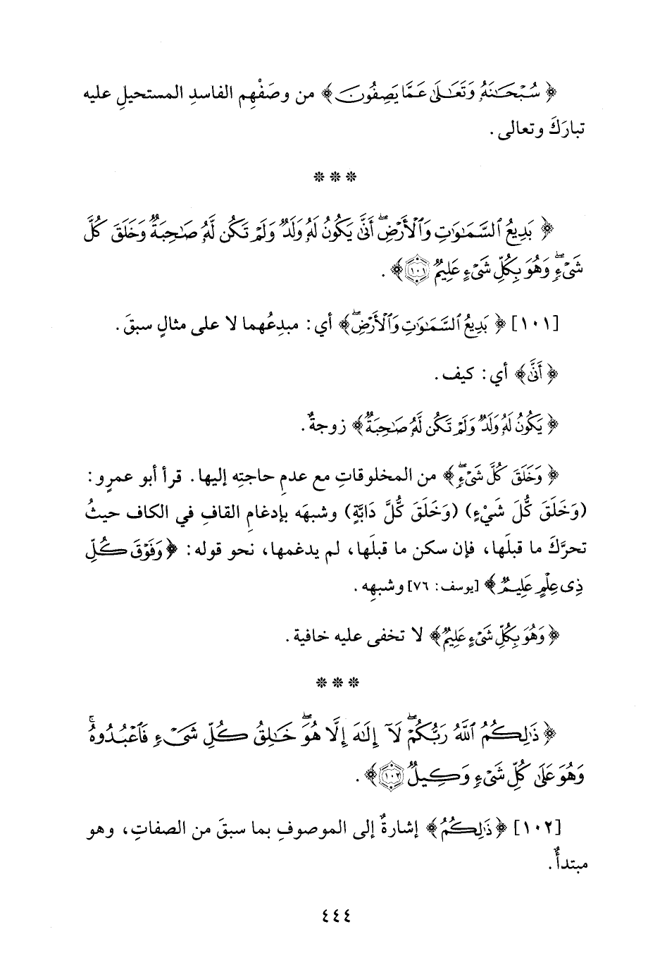 {بَدِيعُ السَّمَاوَاتِ وَالْأَرْضِ أَنَّى يَكُونُ لَهُ وَلَدٌ وَلَمْ تَكُنْ لَهُ صَاحِبَةٌ وَخَلَقَ كُلَّ شَيْءٍ وَهُوَ بِكُلِّ شَيْءٍ عَلِيمٌ (101)}.