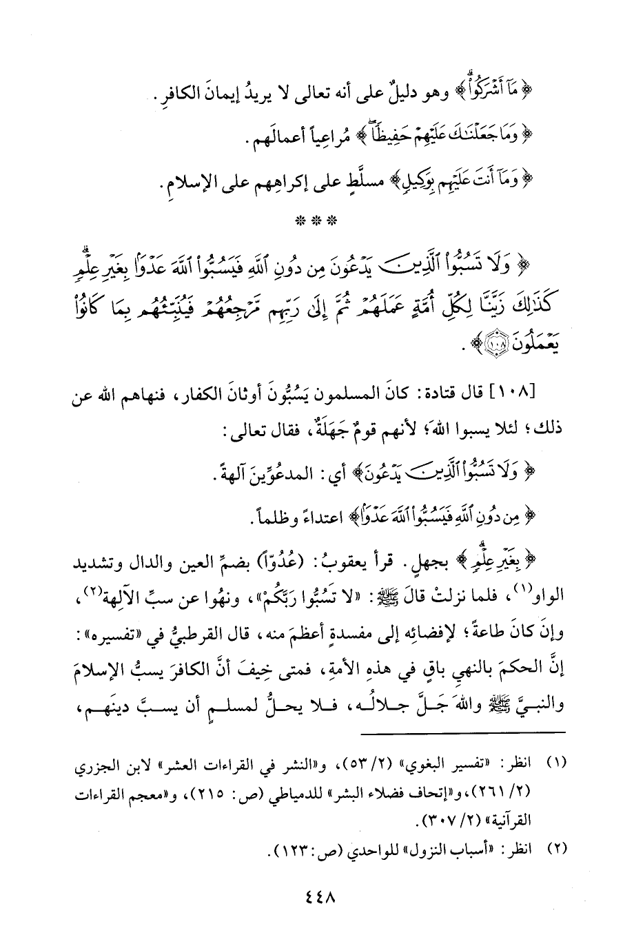 {وَلَا تَسُبُّوا الَّذِينَ يَدْعُونَ مِنْ دُونِ اللَّهِ فَيَسُبُّوا اللَّهَ عَدْوًا بِغَيْرِ عِلْمٍ كَذَلِكَ زَيَّنَّا لِكُلِّ أُمَّةٍ عَمَلَهُمْ ثُمَّ إِلَى رَبِّهِمْ مَرْجِعُهُمْ فَيُنَبِّئُهُمْ بِمَا كَانُوا يَعْمَلُونَ (108)}.