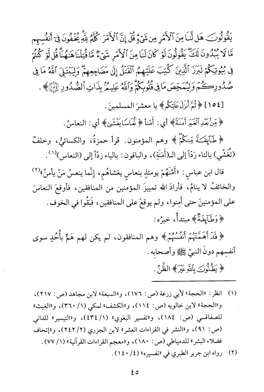 {طَائِفَةً مِنْكُمْ} وهم المؤمنون. قرأ حمزةُ، والكسائيُّ، وخلفٌ (تُغَشِّي) بالتاء رَدًّا إلى الـ (أَمَنَةِ)، والباقون: بالياء ردًّا إلى (النعاس) (¬1).