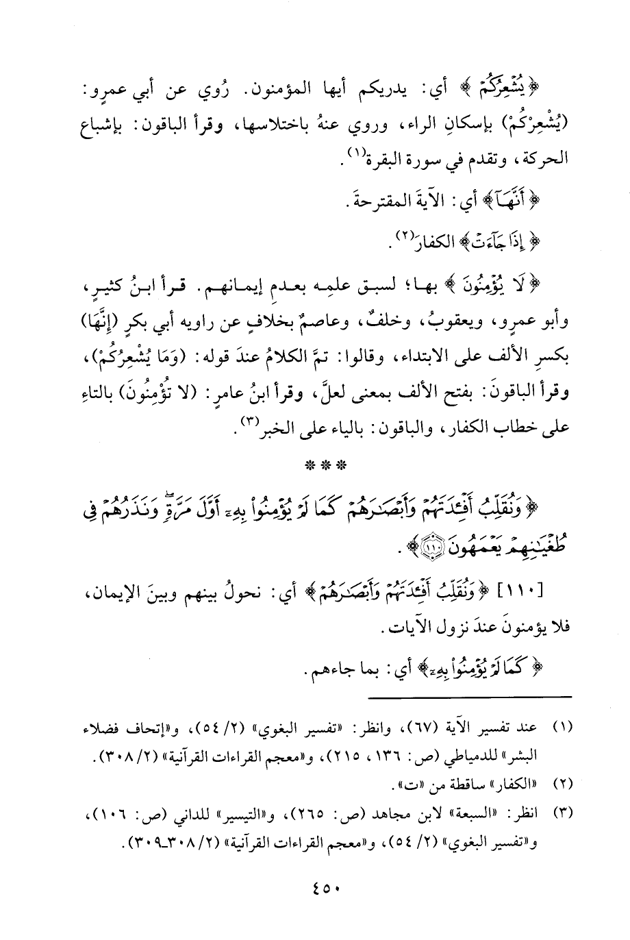 {لَا يُؤْمِنُونَ} بها؛ لسبق علمِه بعدمِ إيمانهم. قرأ ابنُ كثيرٍ، وأبو عمرو، ويعقوبُ، وخلفٌ، وعاصمٌ بخلافٍ عن راويه أبي بكرٍ (إِنَّهَا) بكسرِ الألف على الابتداء، وقالوا: تمَّ الكلامُ عندَ قوله: (وَمَا يُشْعِرُكُمْ)، وقرأ الباقونَ: بفتح الألف بمعنى لعلَّ، وقرأ ابنُ عامرٍ: (لا تُؤْمِنُونَ) بالتاءِ على خطاب الكفار، والباقون: بالياء على الخبر (¬3).