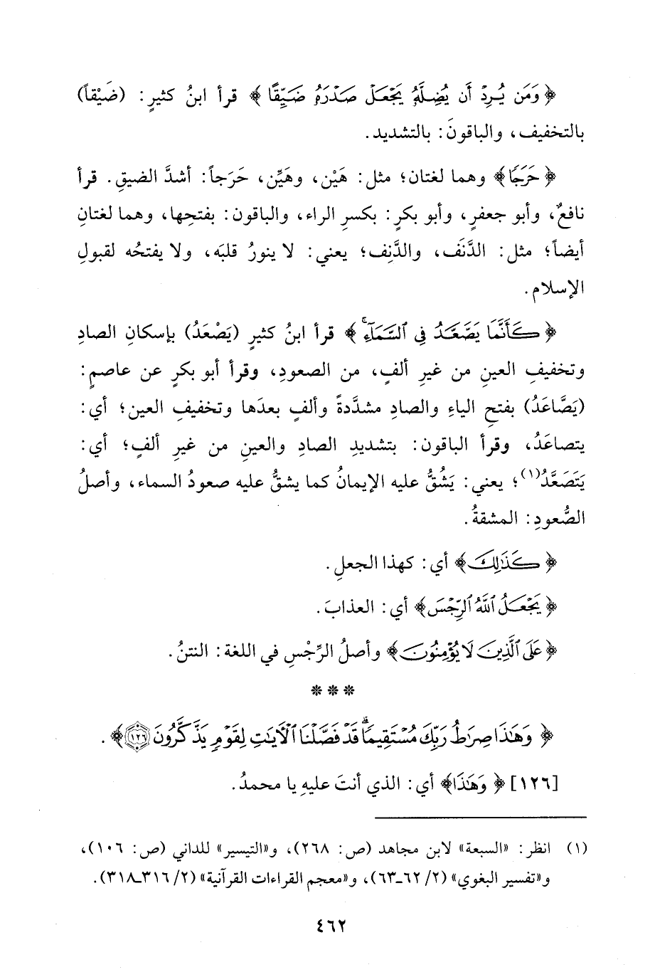 {كَأَنَّمَا يَصَّعَّدُ فِي السَّمَاءِ} قرأ ابنُ كثيرٍ (يَصْعَدُ) بإسكانِ الصادِ وتخفيفِ العينِ من غيرِ ألفٍ، من الصعودِ، وقرأ أبو بكرٍ عن عاصمٍ: (يَصَّاعَدُ) بفتحِ الياءِ والصادِ مشدَّدةً وألفٍ بعدَها وتخفيفِ العين؛ أي: يتصاعَدُ، وقرأ الباقون: بتشديدِ الصادِ والعينِ من غيرِ ألفٍ؛ أي: يَتَصَعَّدُ (¬1)؛ يعني: يَشُقُّ عليه الإيمانُ كما يشقُّ عليه صعودُ السماء، وأصلُ الصُّعودِ: المشقةُ.