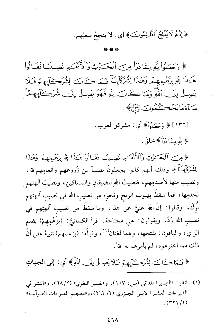 {وَجَعَلُوا لِلَّهِ مِمَّا ذَرَأَ مِنَ الْحَرْثِ وَالْأَنْعَامِ نَصِيبًا فَقَالُوا هَذَا لِلَّهِ بِزَعْمِهِمْ وَهَذَا لِشُرَكَائِنَا فَمَا كَانَ لِشُرَكَائِهِمْ فَلَا يَصِلُ إِلَى اللَّهِ وَمَا كَانَ لِلَّهِ فَهُوَ يَصِلُ إِلَى شُرَكَائِهِمْ سَاءَ مَا يَحْكُمُونَ (136)}.