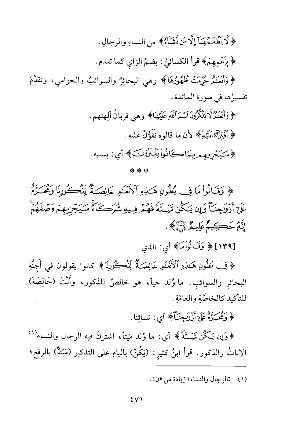 {وَقَالُوا مَا فِي بُطُونِ هَذِهِ الْأَنْعَامِ خَالِصَةٌ لِذُكُورِنَا وَمُحَرَّمٌ عَلَى أَزْوَاجِنَا وَإِنْ يَكُنْ مَيْتَةً فَهُمْ فِيهِ شُرَكَاءُ سَيَجْزِيهِمْ وَصْفَهُمْ إِنَّهُ حَكِيمٌ عَلِيمٌ (139)}.