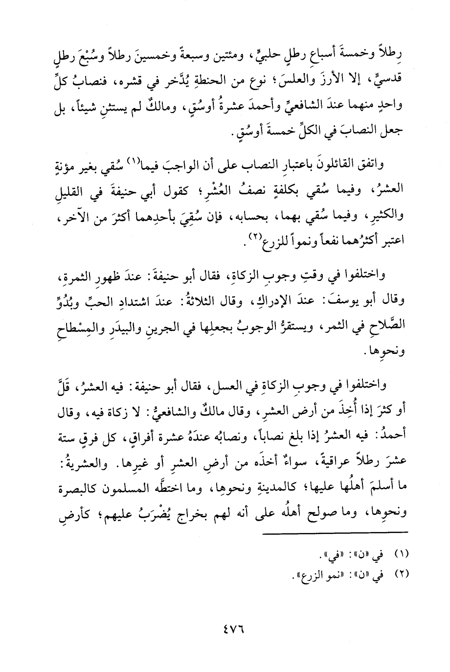 واتفق القائلونَ باعتبارِ النصاب على أن الواجبَ فيما (¬1) سُقي بغير مؤنةٍ العشرُ، وفيما سُقي بكلفةٍ نصف العُشْرِ؛ يقول أبي حنيفةَ في القليلِ والكثيرِ، وفيما سُقي بهما، بحسابه، فإن سُقِيَ بأحدِهما أكثرَ من الآخر، اعتبر أكثرُهما نفعًا ونموًا للزرع (¬2).