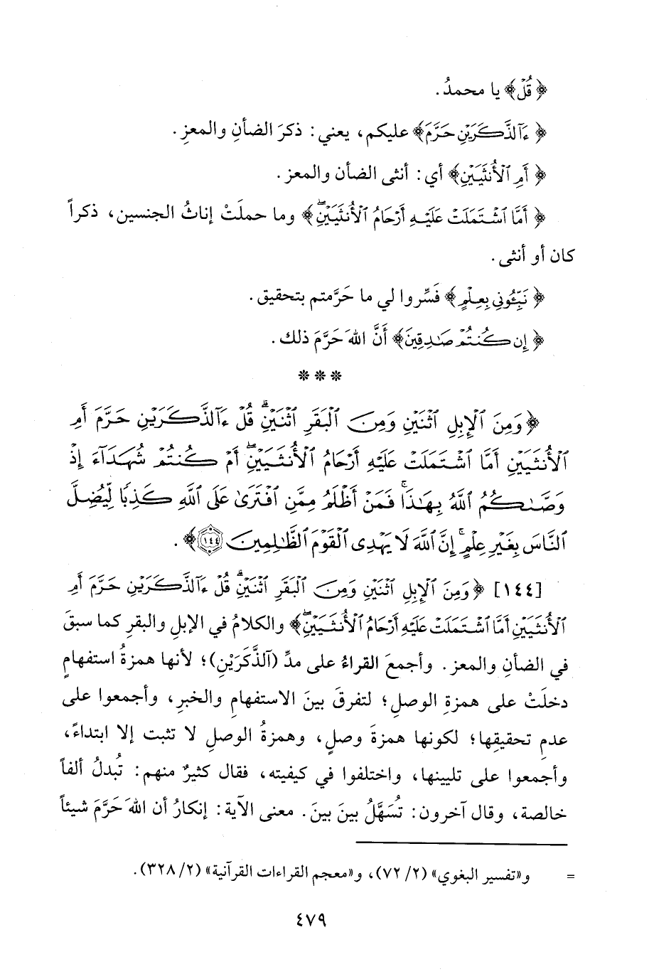 [144] {وَمِنَ الْإِبِلِ اثْنَيْنِ وَمِنَ الْبَقَرِ اثْنَيْنِ قُلْ آلذَّكَرَيْنِ حَرَّمَ أَمِ الْأُنْثَيَيْنِ أَمَّا اشْتَمَلَتْ عَلَيْهِ أَرْحَامُ الْأُنْثَيَيْنِ} والكلامُ في الإبلِ والبقرِ كما سبقَ في الضأنِ والمعز. وأجمعَ القراءُ على مدِّ (آلذَّكَرَيْنِ)؛ لأنها همزةُ استفهامٍ دخلَتْ على همزةِ الوصلِ؛ لتفرقَ بينَ الاستفهامِ والخبرِ، وأجمعوا على عدمِ تحقيقِها؛ لكونها همزةَ وصل، وهمزةُ الوصلِ لا تثبت إلا ابتداءً، وأجمعوا على تليينها، واختلفوا في كيفيته، فقال كثيرٌ منهم: تُبدلُ ألفًا خالصة، وقال آخرون: تسُهَّلُ بينَ بينَ. معنى الآية: إنكارُ أن الله حَرَّمَ شيئًا