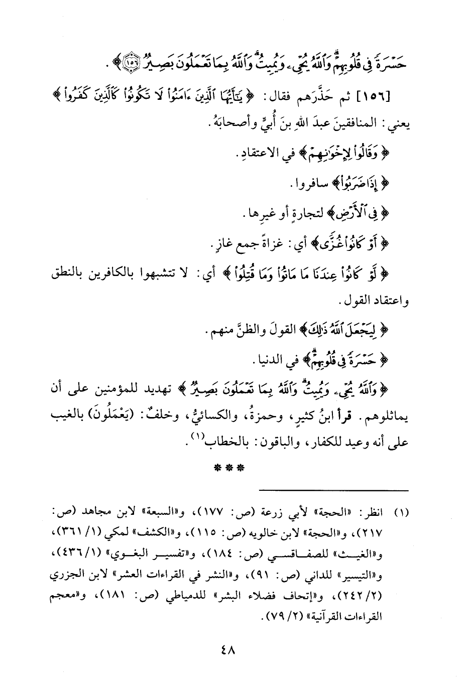 {وَاللَّهُ يُحْيِي وَيُمِيتُ وَاللَّهُ بِمَا تَعْمَلُونَ بَصِيرٌ} تهديد للمؤمنين على أن يماثلوهم. قرأ ابنُ كثيرٍ، وحمزةُ، والكسائيُّ، وخلفٌ: (يَعْمَلُونَ) بالغيب على أنه وعيد للكفار، والباقون: بالخطاب (¬1).