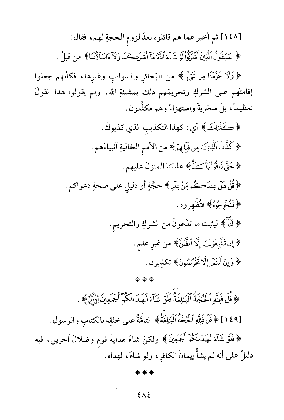 [149] {قُلْ فَلِلَّهِ الْحُجَّةُ الْبَالِغَةُ} التامَّةُ على خلقِه بالكتابِ والرسول.