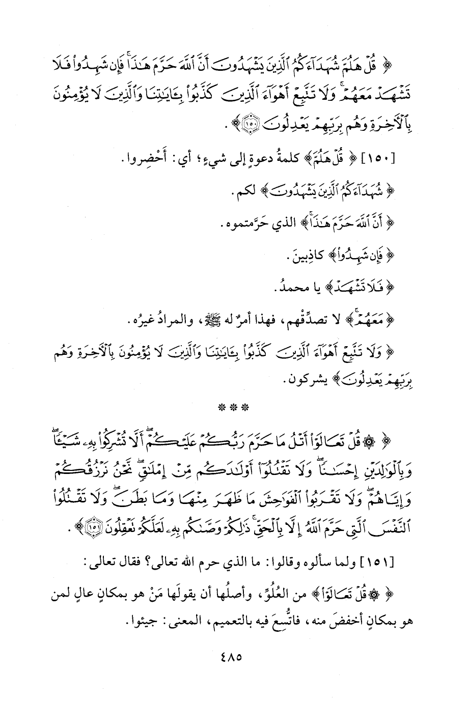 {قُلْ تَعَالَوْا أَتْلُ مَا حَرَّمَ رَبُّكُمْ عَلَيْكُمْ أَلَّا تُشْرِكُوا بِهِ شَيْئًا وَبِالْوَالِدَيْنِ إِحْسَانًا وَلَا تَقْتُلُوا أَوْلَادَكُمْ مِنْ إِمْلَاقٍ نَحْنُ نَرْزُقُكُمْ وَإِيَّاهُمْ وَلَا تَقْرَبُوا الْفَوَاحِشَ مَا ظَهَرَ مِنْهَا وَمَا بَطَنَ وَلَا تَقْتُلُوا النَّفْسَ الَّتِي حَرَّمَ اللَّهُ إِلَّا بِالْحَقِّ ذَلِكُمْ وَصَّاكُمْ بِهِ لَعَلَّكُمْ تَعْقِلُونَ (151)}.