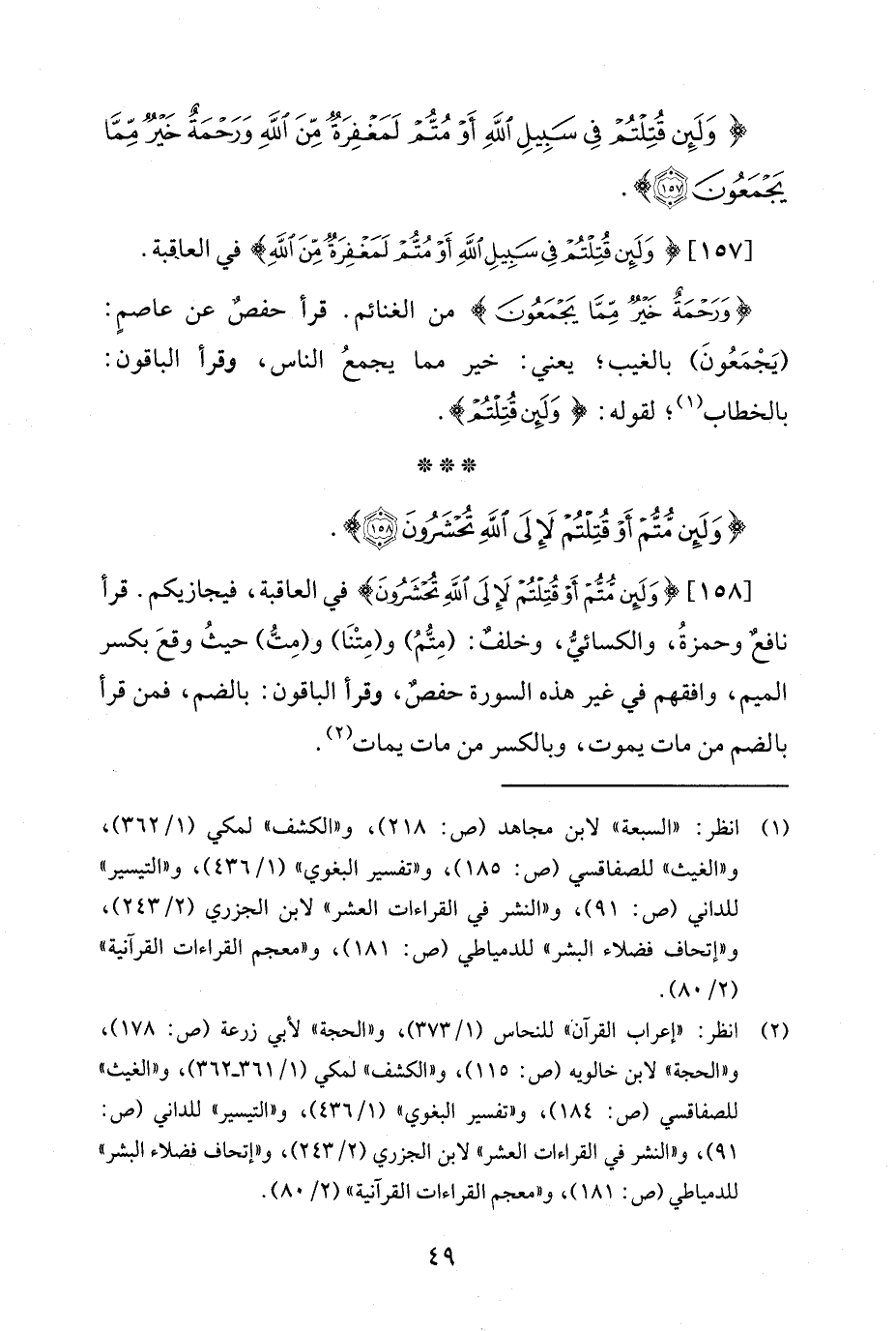 [158] {وَلَئِنْ مُتُّمْ أَوْ قُتِلْتُمْ لَإِلَى اللَّهِ تُحْشَرُونَ} في العاقبة، فيجازيكم. قرأ نافعٌ وحمزةُ، والكسائيُّ، وخلفٌ: (مِتُّمُ) و (مِتْنَا) و (مِتُّ) حيثُ وقعَ بكسر الميم، وافقهم في غير هذه السورة حفصٌ، وقرأ الباقون: بالضم، فمن قرأ بالضم من مات يموت، وبالكسر من مات يمات (¬2).