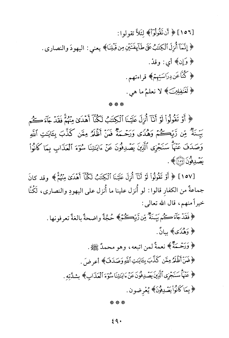 [157] {أَوْ تَقُولُوا لَوْ أَنَّا أُنْزِلَ عَلَيْنَا الْكِتَابُ لَكُنَّا أَهْدَى مِنْهُمْ} وقد كان جماعةٌ من الكفارِ قالوا: لو أُنزل علينا ما أُنزل على اليهودِ والنصارى، لَكُنَّا خيرًا منهم، قال الله تعالى: