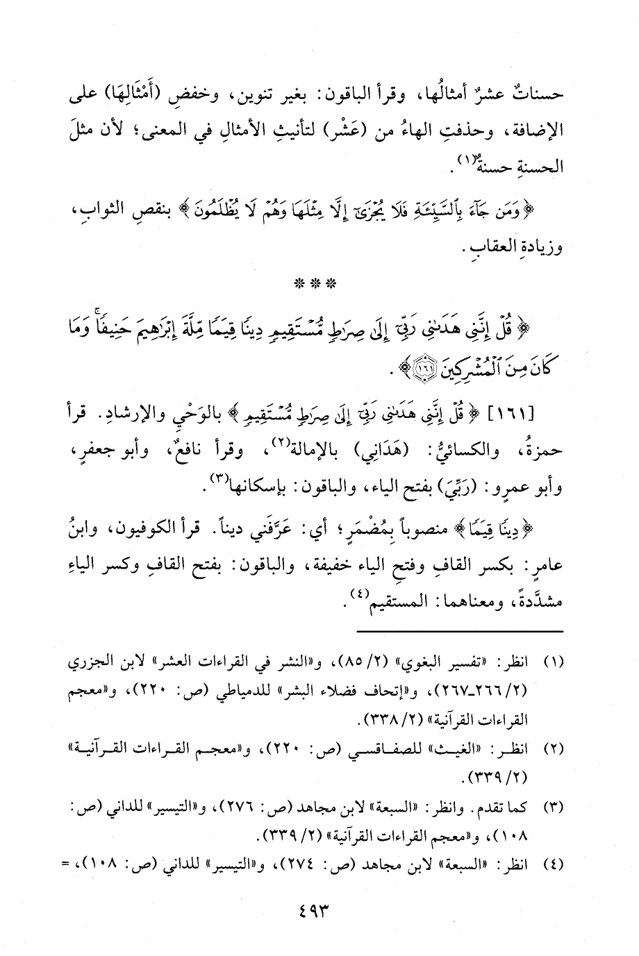 [161] {قُلْ إِنَّنِي هَدَانِي رَبِّي إِلَى صِرَاطٍ مُسْتَقِيمٍ} بالوحْيِ والإرشادِ. قرأ حمزةُ، والكسائيُّ: (هَدَانِي) بالإمالة (¬2)، وقرأ نافعٌ، وأبو جعفرٍ، وأبو عمرٍو: (رَبِّيَ) بفتح الياء، والباقون: بإسكانها (¬3).