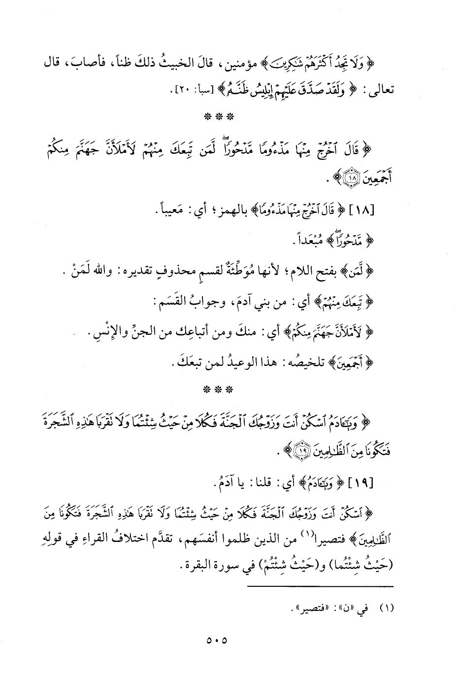 {اسْكُنْ أَنْتَ وَزَوْجُكَ الْجَنَّةَ فَكُلَا مِنْ حَيْثُ شِئْتُمَا وَلَا تَقْرَبَا هَذِهِ الشَّجَرَةَ فَتَكُونَا مِنَ الظَّالِمِينَ} فتصيرا (¬1) من الذين ظلموا أنفسَهم، تقدَّم اختلافُ القراءِ في قولهِ (حَيْثُ شِئْتُما) و (حَيْثُ شِئْتُمْ) في سورة البقرة.