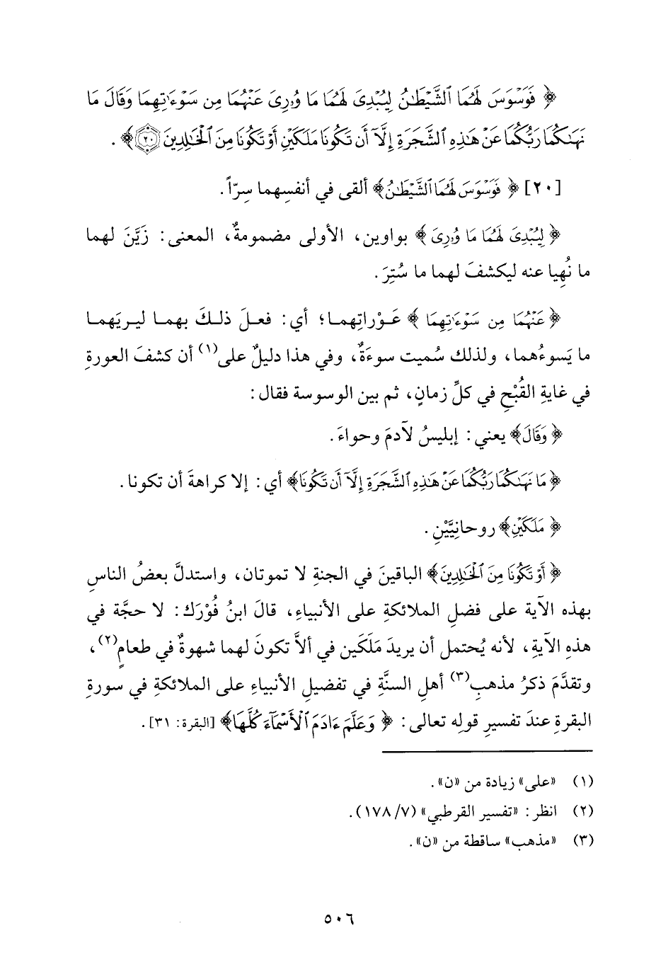 {أَوْ تَكُونَا مِنَ الْخَالِدِينَ} الباقينَ في الجنةِ لا تموتان، واستدلَّ بعضُ الناسِ بهذه الآية على فضلِ الملائكةِ على الأنبياءِ، قالَ ابنُ فُوْرَك: لا حجَّة في هذهِ الآيةِ؛ لأنه يُحتمل أن يريدَ مَلَكَين في ألَّا تكونَ لهما شهوةٌ في طعامٍ (¬2)، وتقدَّمَ ذكرُ مذهبِ (¬3) أهلِ السنَّةِ في تفضيلِ الأنبياءِ على الملائكةِ في سورةِ البقرةِ عندَ تفسيرِ قوله تعالى: {وَعَلَّمَ آدَمَ الْأَسْمَاءَ كُلَّهَا} [البقرة: 31].