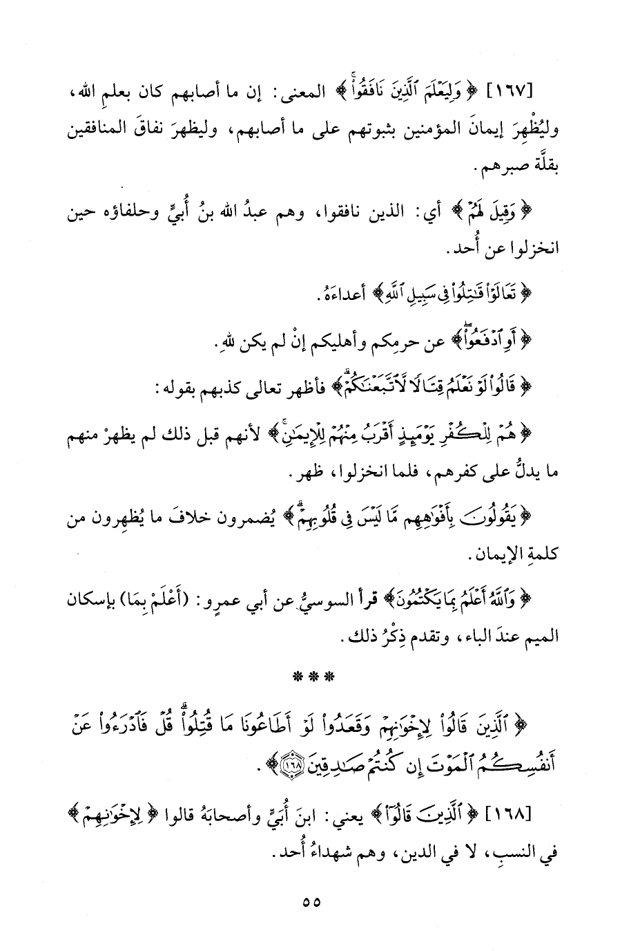 [167] {وَلِيَعْلَمَ الَّذِينَ نَافَقُوا} المعنى: إن ما أصابهم كان بعلمِ الله، وليُظْهِرَ إيمانَ المؤمنين بثبوتهم على ما أصابهم، وليظهرَ نفاقَ المنافقين بقلَّة صبرهم.