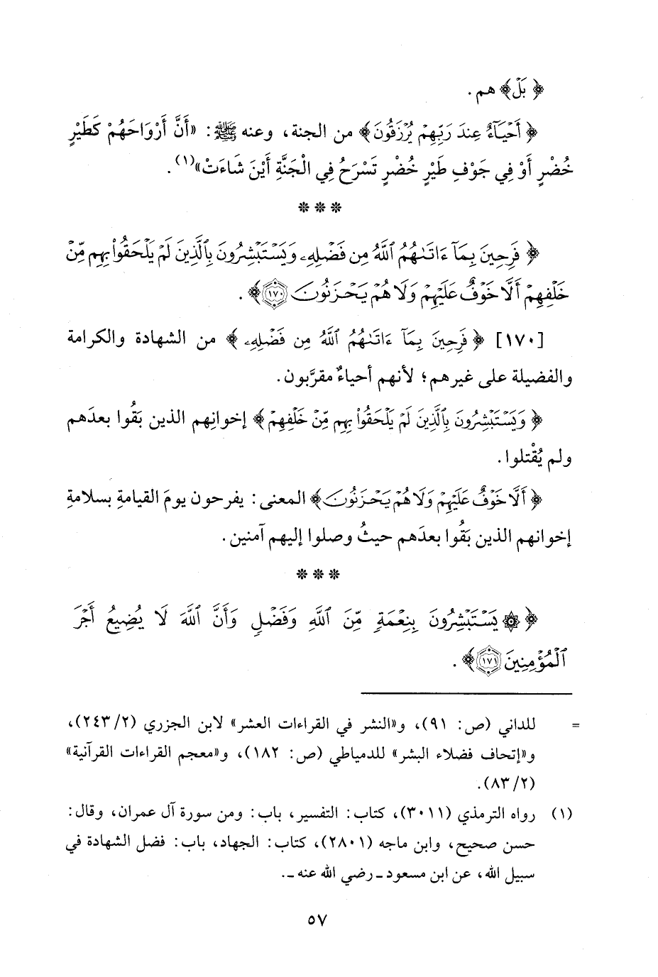(¬1) رواه الترمذي (3011)، كتاب: التفسير، باب: ومن سورة آل عمران، وقال: حسن صحيح، وابن ماجه (2801)، كتاب: الجهاد، باب: فضل الشهادة في سبيل الله، عن ابن مسعود -رضي الله عنه-.