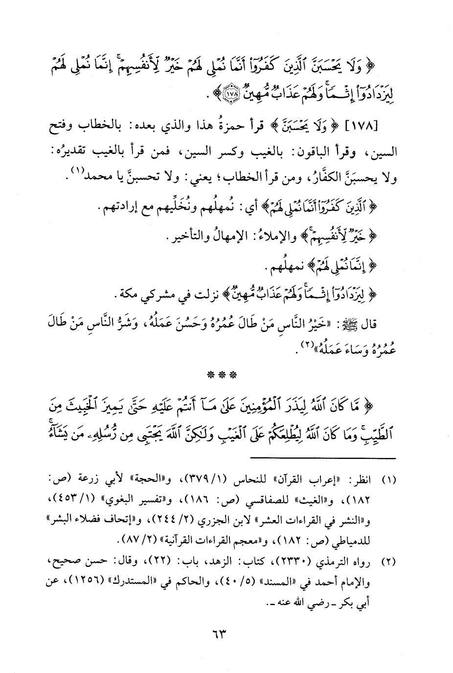 [178] {وَلَا يَحْسَبَنَّ} قرأ حمزةُ هذا والذي بعده: بالخطاب وفتح السين، وقرأ الباقون: بالغيب وكسر السين، فمن قرأ بالغيب تقديرُه: ولا يحسبَنَّ الكفَّارُ، ومن قرأ الخطاب؛ يعني: ولا تحسبنَّ يا محمد (¬1).