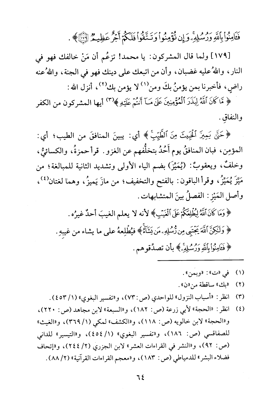 [179] ولما قال المشركون: يا محمد! تزعُم أن مَنْ خالفك فهو في النار، واللهُ عليه غضبان، وأن من اتبعك على دينك فهو في الجنة، واللهُ عنه راضٍ، فأخبرنا بمن يؤمنُ بكَ ومن (¬1) لا يؤمن بك (¬2)، أنزل الله: