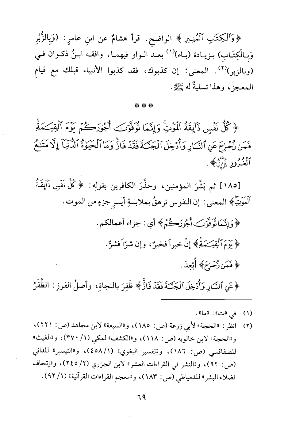 {وَالْكِتَابِ الْمُنِيرِ} الواضحِ. قرأ هشامٌ عن ابنِ عامرٍ: {وَبِالزُّبُرِ وَبِالْكِتَابِ} بزيادة (باء) (¬1) بعد الواو فيهما، وافقه ابنُ ذكوان في (وبالزبر) (¬2). المعنى: إن كذبوك، فقد كذبوا الأنبياء قبلك مع قيامِ المعجز، وهذا تسليةٌ له - صلى الله عليه وسلم -.