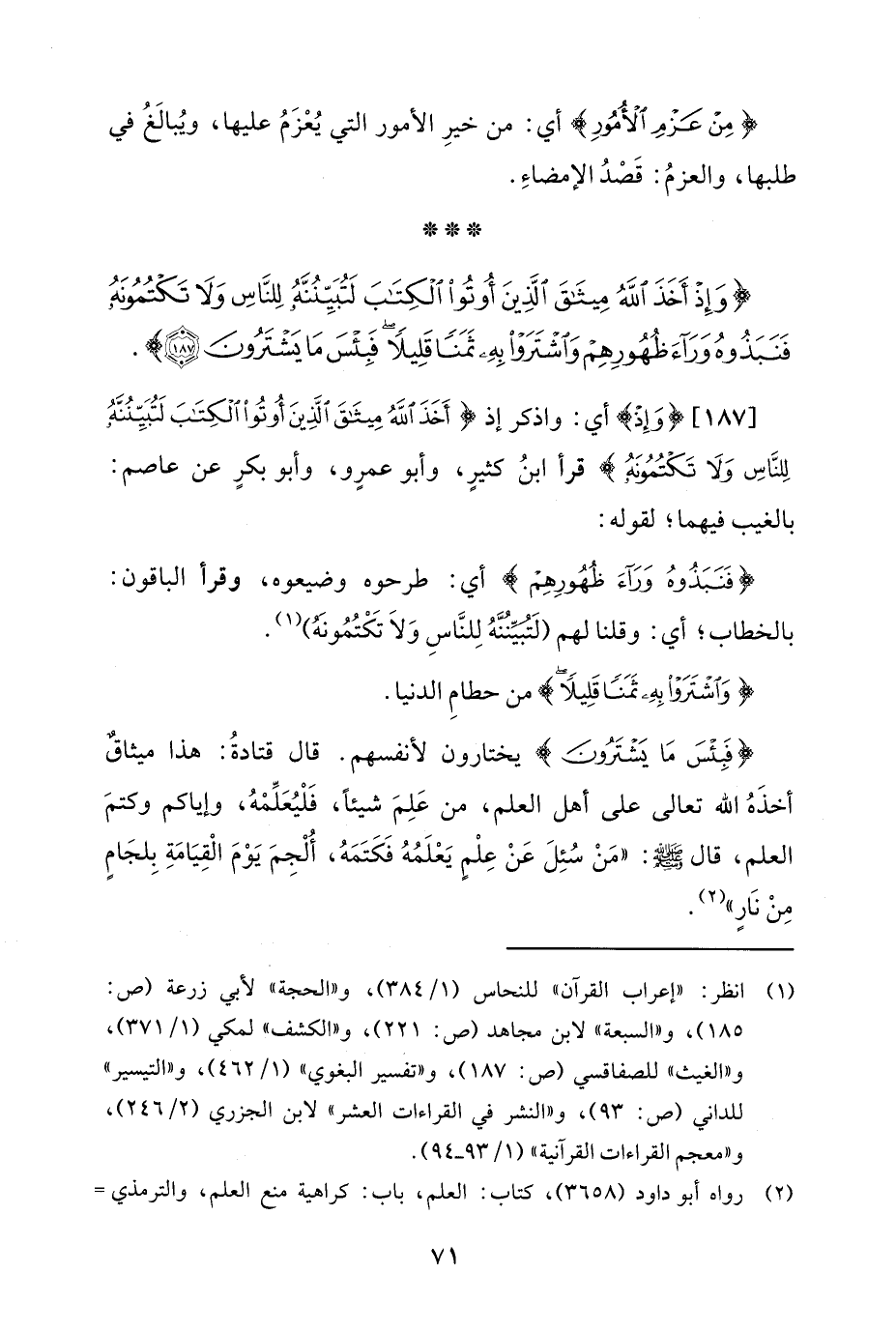 [187] {وَإِذْ} أي: واذكر إذ {أَخَذَ اللَّهُ مِيثَاقَ الَّذِينَ أُوتُوا الْكِتَابَ لَتُبَيِّنُنَّهُ لِلنَّاسِ وَلَا تَكْتُمُونَهُ} قرأ ابنُ كثيرٍ، وأبو عمرٍو، وأبو بكرٍ عن عاصم: بالغيب فيهما؛ لقوله: