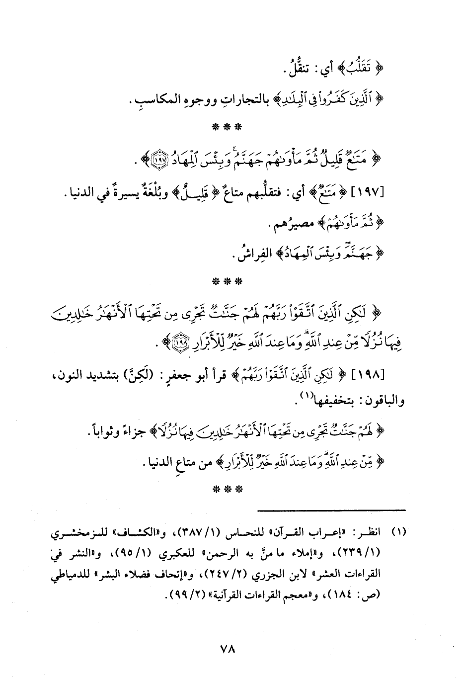[198] {لَكِنِ الَّذِينَ اتَّقَوْا رَبَّهُمْ} قرأ أبو جعفرٍ: (لَكِنَّ) بتشديد النون، والباقون: بتخفيفها (¬1).