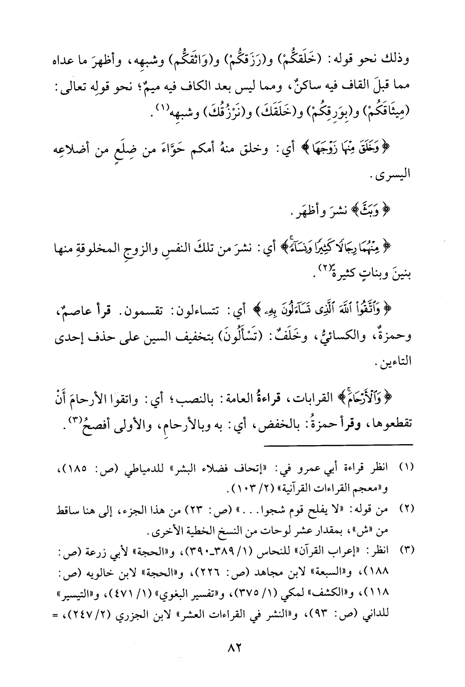 {وَالْأَرْحَامَ} القرابات، قراءةُ العامة: بالنصب؛ أي: واتقوا الأرحامَ أَنْ تقطعوها، وقرأ حمزةُ: بالخفض، أي: به وبالأرحامِ، والأولى أفصحُ (¬3).