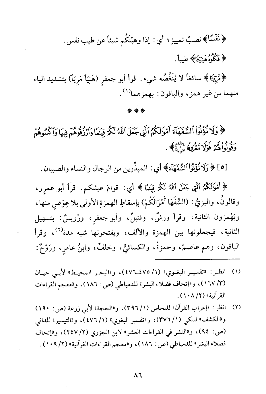 {أَمْوَالَكُمُ الَّتِي جَعَلَ اللَّهُ لَكُمْ قِيَامًا} أي: قوامَ عيشكم. قرأ أبو عمرٍو، وقالونُ، والبزيُّ: (السُّفَهَا أَمْوَالَكُمْ) بإسقاطِ الهمزةِ الأولى بلا عِوَضٍ منها، ويَهْمزون الثانية، وقرأ ورشٌ، وقنبلٌ، وأبو جعفرٍ، ورُويسٌ: بتسهيل الثانية، فيجعلونها بين الهمزة والألف، ويفتحونها شبه مدة (¬2)، وقرأ الباقون، وهم عاصمٌ، وحمزةُ، والكسائيُّ، وخلفٌ، وابنُ عامرٍ، ورَوْحٌ: